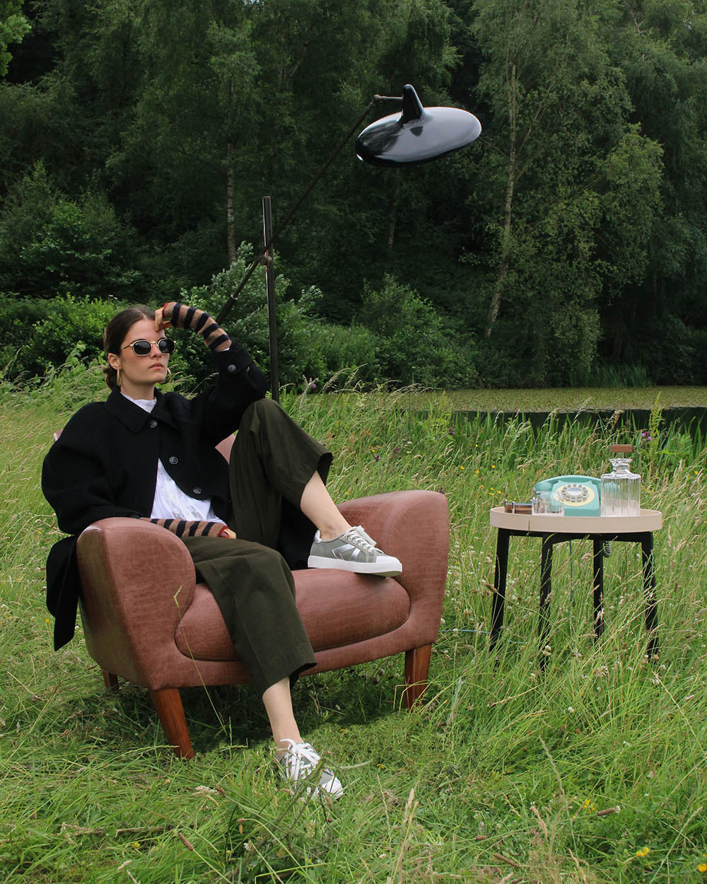 Discover the perfect blend of comfort and timeless style with our Helios textile low-top sneakers. Designed in London and ethically handcrafted in Europe, these shoes feature a soft and breathable khaki green canvas upper and our signature delta-triangle detail in a silver leather, a silver leather heel, supple bamboo lining, white rubber outsoles and off-white Tencel laces.